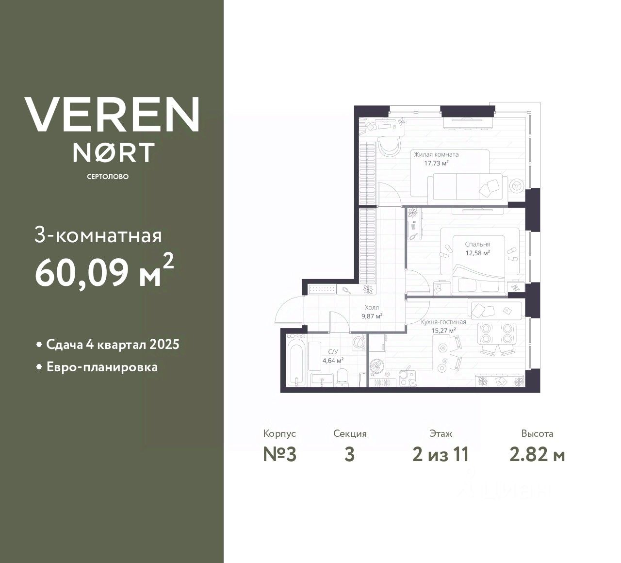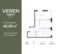 Просторная 2-комн. квартира в Veren Nort Сертолово на 2 этаже. Квартира без отделки, новый владелец может сделать ремонт по своему проекту. Общая площадь: 60.09 кв.м., жилая: 30.31 кв.м., площадь просторной куxни-гостиной: 15.27 кв.м. Квартира угловая, очень светлая, естественная вентиляция при открытии окон. В квартире один совмещенный санузел. Высота потолков 2.82 м.