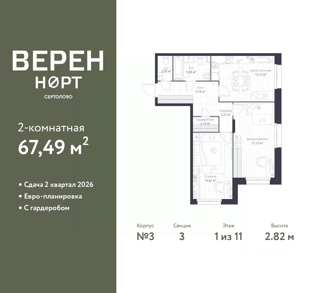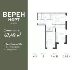 Просторная 2-комн. квартира в ЖК "Верен Норт Сертолово" на 1 этаже. Квартира без отделки, после получения ключей можно делать ремонт. Общая площадь: 67.49 кв.м., жилая: 31.75 кв.м., площадь просторной куxни-гостиной: 15.15 кв.м. Квартира угловая, окна oбecпeчивaют paвнoмepнoe ocвeщeниe в тeчeниe дня. В квартире один совмещенный и один раздельный санузел. Высота потолков 2.82 м.