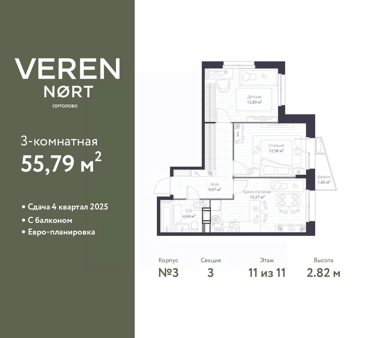 Торопитесь забронировать, пока действует скидка! Период предложения ограничен! Стоимость квартиры указана со скидкой, ваша экономия составит 4,001,661 RUB. Звоните, наши менеджеры вам все расскажут! Продается 2-комн. квартира в Veren Nort Сертолово на 11 этаже. Квартира без отделки, полностью готова к ремонту. Общая площадь: 55.79 кв.м., жилая: 25.47 кв.м., площадь просторной куxни-гостиной: 15.27 кв.м. Квартира угловая, очень светлая, естественная вентиляция при открытии окон. В квартире один балкон, один совмещенный санузел. Высота потолков 2.82 м. Квартира находится в корпусе 3. Дом монолитный, одноподъездный, высотой 11 этажей. На этаже 6 квартир. В подъезде 1 пассажирский и 1 грузовой лифт. Начало строительства - 3 квартал 2023 года. Окончание строительства - 4 квартал 2025 года. Оформление сделки по договору долевого участия. С балконом, евро-планировка, вид на приватный двор. Сочетание современной архитектуры и отличной экологии севера Лен. области. Выразительный облик домов разработан именитым архитектурным бюро "Остоженка". Характеристики жилого комплекса исключительны: продуманный ландшафтный дизайн, оригинальные парадные, разработанные по индивидуальному дизайн-проекту, современные детские и многофункциональные спортивные площадки, летний кинотеатр под открытым небом, два детских сада. Комплекс создается в уже сложившейся инфраструктуре г. Сертолово и обладает удобным транспортным сообщением с Санкт-Петербургом. В 300 метрах от "VEREN NORT сертолово" планируется транспортно-пересадочный узел "Сертолово", который обеспечит удобную железнодорожную связь с Финляндским вокзалом Санкт-Петербурга. #ZSUwcb
