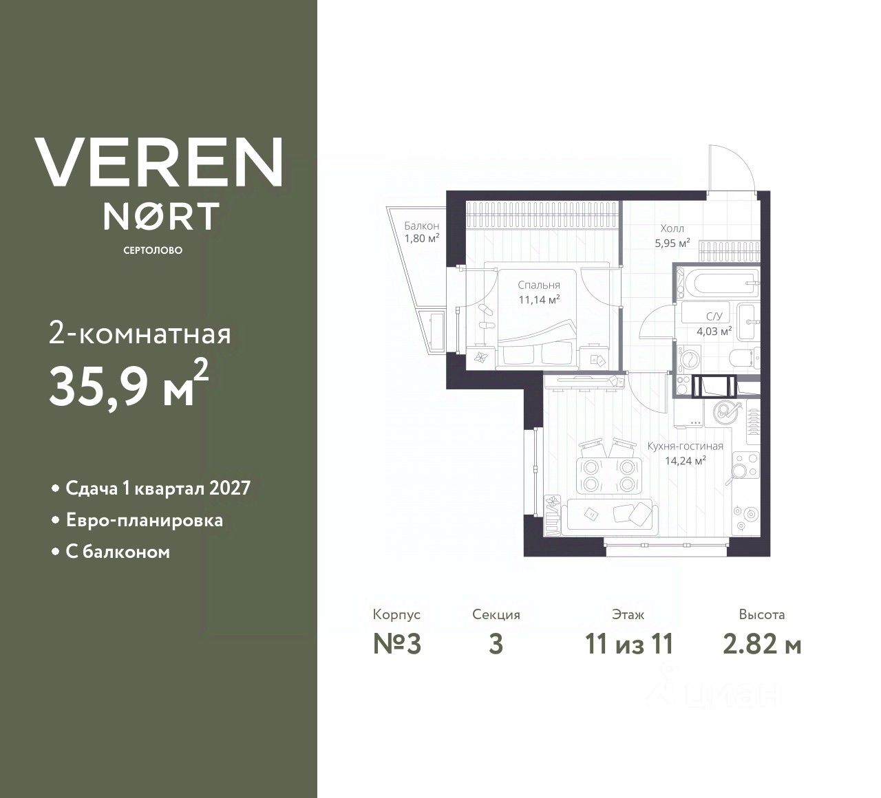 Однокомнатная квартира в Veren Nort Сертолово на 11 этаже. Квартира без отделки, после оформления собственности можно делать ремонт. Общая площадь: 35.9 кв.м., жилая: 11.14 кв.м., площадь просторной куxни-гостиной: 14.24 кв.м. Угловая квартира, идеально подойдет любителям тишины и панорамных видов. В квартире один балкон, один совмещенный санузел. Высота потолков 2.82 м.