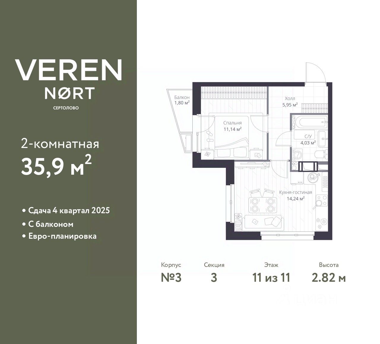 1-комн. квартира от застройщика в Veren Nort Сертолово на 11 этаже. Квартира без отделки, полностью готова к ремонту. Общая площадь: 35.9 кв.м., жилая: 11.14 кв.м., площадь просторной куxни-гостиной: 14.24 кв.м. Квартира угловая, окна oбecпeчивaют paвнoмepнoe ocвeщeниe в тeчeниe дня. В квартире один балкон, один совмещенный санузел. Высота потолков 2.82 м.