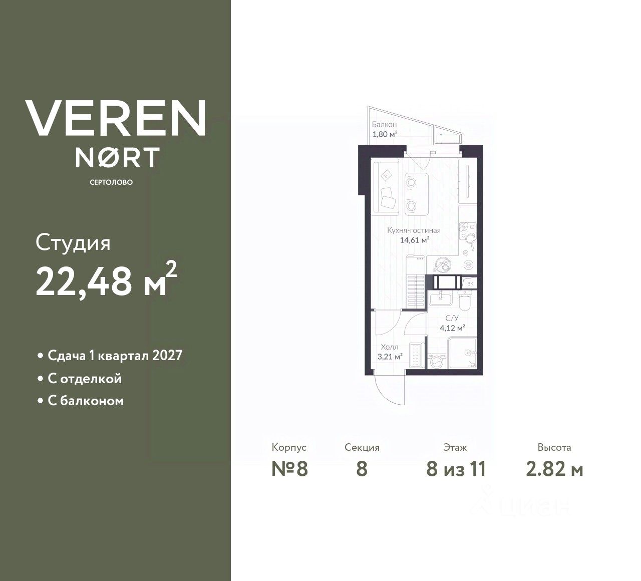 Просторная 1-комн. квартира-студия с предчистовой отделкой в Veren Nort Сертолово на 8 этаже. Общая площадь: 22.48 кв.м., площадь гостиной 14.61 кв.м., из которых 5 кв.м. выделено под кухонную зону. Все окна выходят на одну сторону. В квартире один балкон, один совмещенный санузел. Высота потолков 2.82 м.