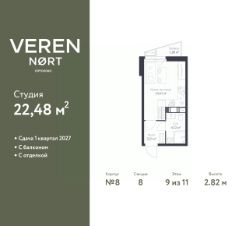 Просторная однокомнатная квартира-студия с предчистовой отделкой в Veren Nort Сертолово на 9 этаже. Общая площадь: 22.48 кв.м., площадь гостиной 14.61 кв.м., из которых 5 кв.м. выделено под кухонную зону. Все окна выходят на одну сторону. В квартире один балкон, один совмещенный санузел. Высота потолков 2.82 м.