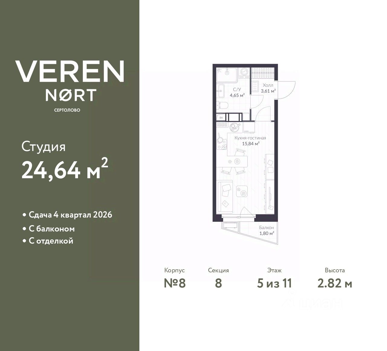 Однокомнатная квартира-студия с предчистовой отделкой в Veren Nort Сертолово на 5 этаже. Общая площадь: 24.64 кв.м., площадь гостиной 15.84 кв.м., из которых 5 кв.м. выделено под кухонную зону. Все окна выходят на одну сторону. В квартире один балкон, один совмещенный санузел. Высота потолков 2.82 м.