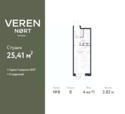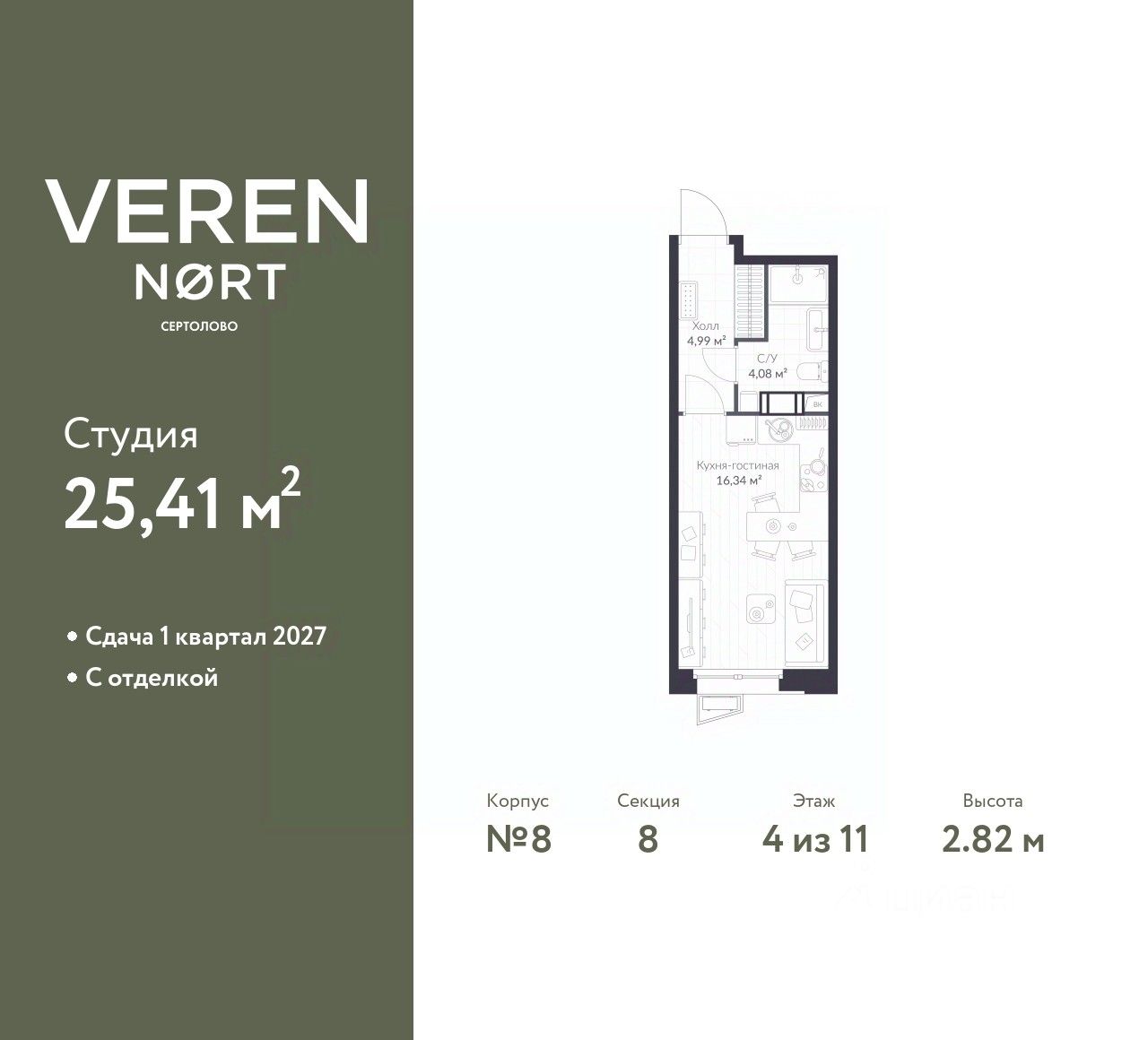 Просторная 1-комн. квартира-студия с предчистовой отделкой в Veren Nort Сертолово на 4 этаже. Общая площадь: 25.41 кв.м., площадь гостиной 16.34 кв.м., из которых 5 кв.м. выделено под кухонную зону. Все окна выходят на одну сторону. В квартире один совмещенный санузел. Высота потолков 2.82 м.