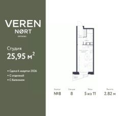 Однокомнатная квартира-студия с предчистовой отделкой в Veren Nort Сертолово на 5 этаже. Общая площадь: 25.95 кв.м., площадь гостиной 16.34 кв.м., из которых 5 кв.м. выделено под кухонную зону. Все окна выходят на одну сторону. В квартире один балкон, один совмещенный санузел. Высота потолков 2.82 м.
