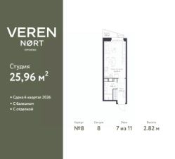 Продается 1-комн. квартира-студия от застройщика в Veren Nort Сертолово на 7 этаже. Квартира без отделки, полностью готова к чистовой отделке и дальнейшему ремонту. Общая площадь: 25.96 кв.м., площадь гостиной 16.33 кв.м., из которых 5 кв.м. выделено под кухонную зону. Все окна выходят на одну сторону. В квартире один балкон, один совмещенный санузел. Высота потолков 2.82 м.