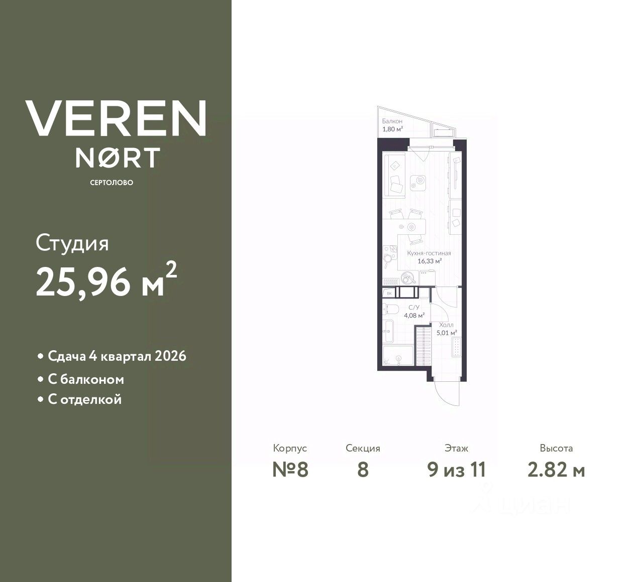 1-комн. квартира-студия от застройщика в Veren Nort Сертолово на 9 этаже. Квартира без отделки, после получения ключей можно делать ремонт. Общая площадь: 25.96 кв.м., площадь гостиной 16.33 кв.м., из которых 5 кв.м. выделено под кухонную зону. Все окна выходят на одну сторону. В квартире один балкон, один совмещенный санузел. Высота потолков 2.82 м.