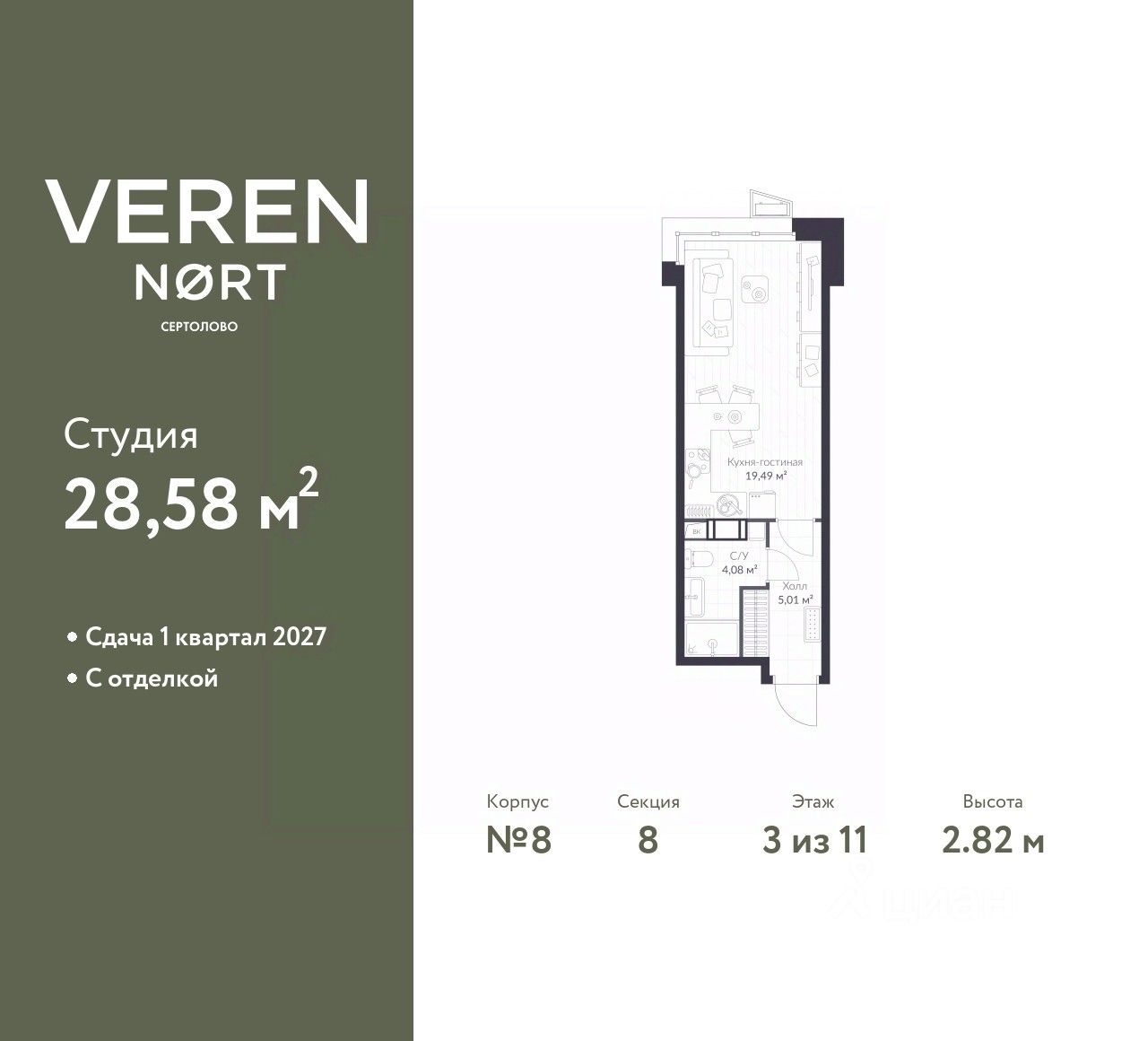Продается однокомнатная квартира-студия с предчистовой отделкой в Veren Nort Сертолово на 3 этаже. Общая площадь: 28.58 кв.м., площадь гостиной 19.49 кв.м., из которых 5 кв.м. выделено под кухонную зону. Все окна выходят на одну сторону. В квартире один совмещенный санузел. Высота потолков 2.82 м.