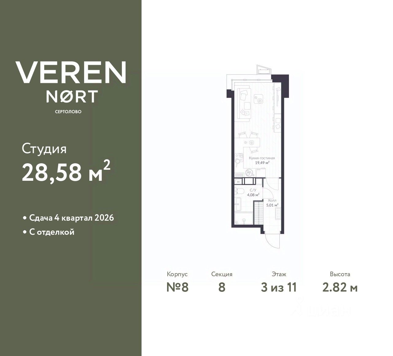 Продается 1-комн. квартира-студия с предчистовой отделкой в Veren Nort Сертолово на 3 этаже. Общая площадь: 28.58 кв.м., площадь гостиной 19.49 кв.м., из которых 5 кв.м. выделено под кухонную зону. Все окна выходят на одну сторону. В квартире один совмещенный санузел. Высота потолков 2.82 м.