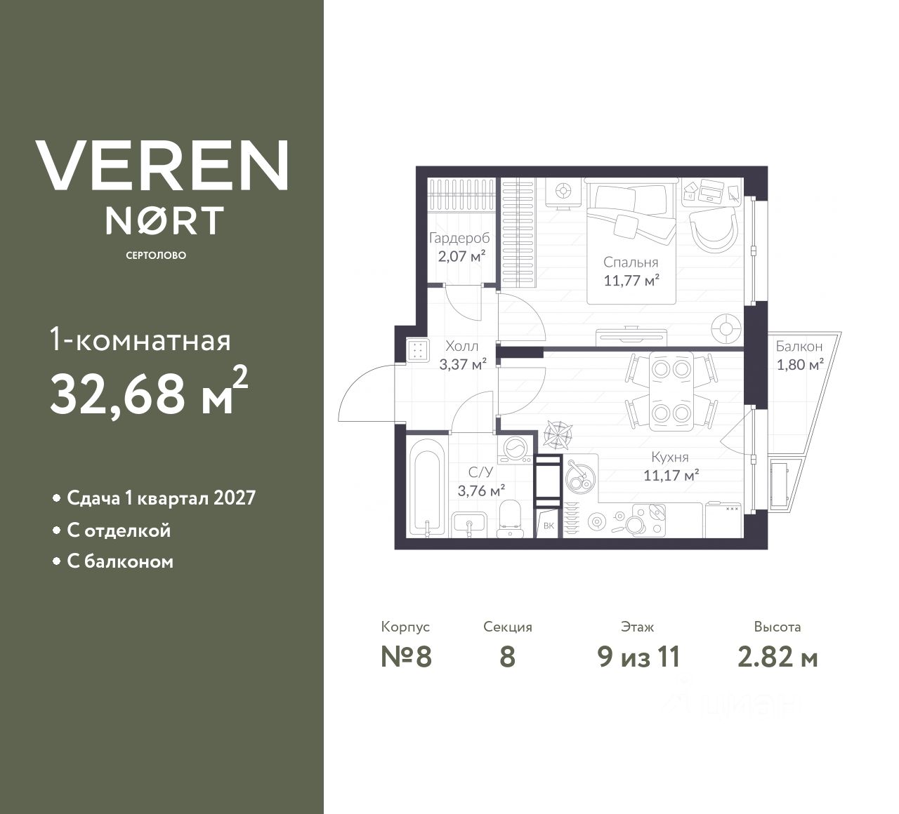1-комн. квартира от застройщика с предчистовой отделкой в Veren Nort Сертолово на 9 этаже. Общая площадь: 32.68 кв.м., жилая: 11.77 кв.м., площадь просторной куxни-гостиной: 11.17 кв.м. Все окна выходят на одну сторону. В квартире один балкон, один совмещенный санузел. Высота потолков 2.82 м.