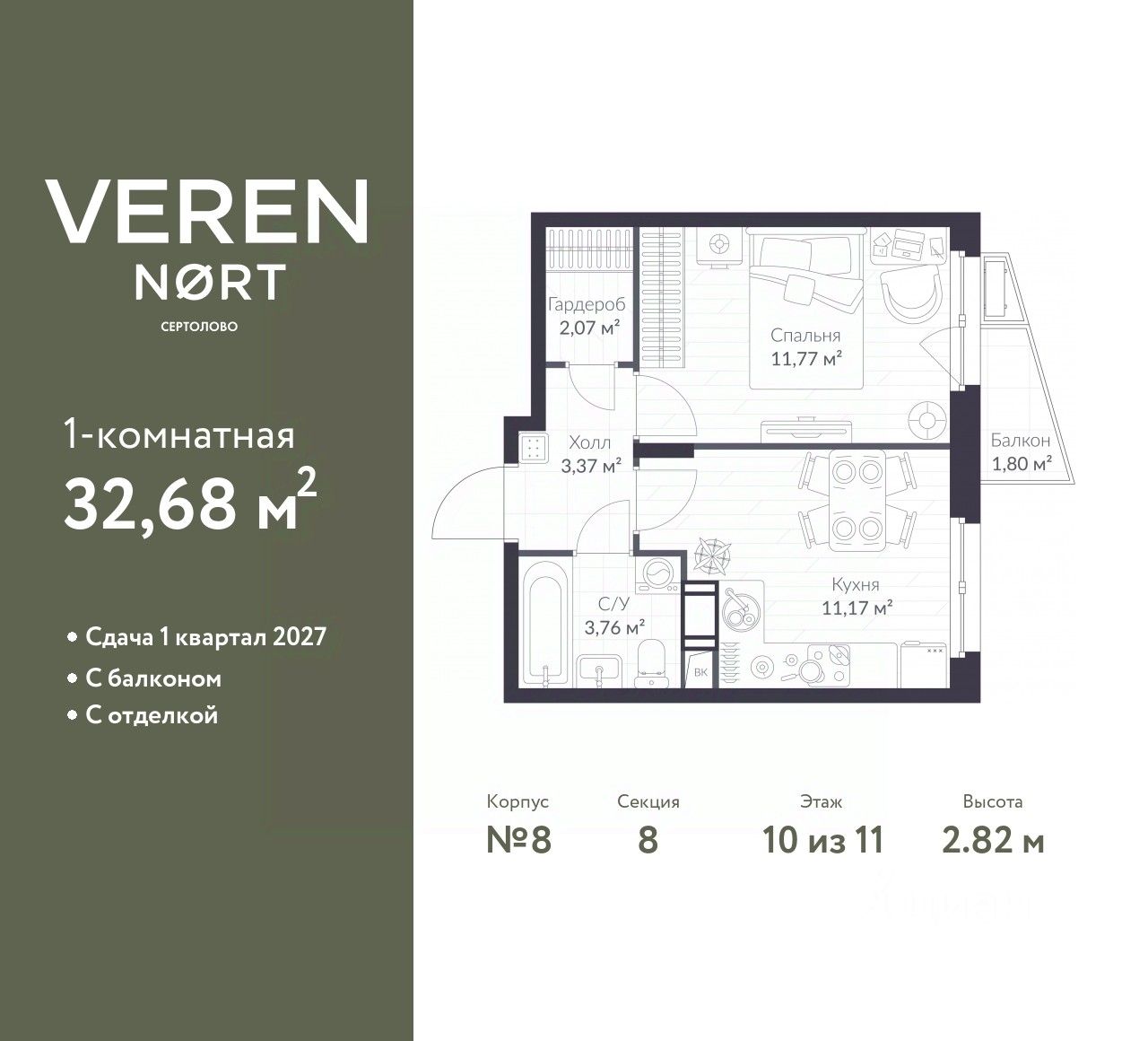 Продается однокомнатная квартира от застройщика с предчистовой отделкой в Veren Nort Сертолово на 10 этаже. Общая площадь: 32.68 кв.м., жилая: 11.77 кв.м., площадь просторной куxни-гостиной: 11.17 кв.м. Все окна выходят на одну сторону. В квартире один балкон, один совмещенный санузел. Высота потолков 2.82 м.