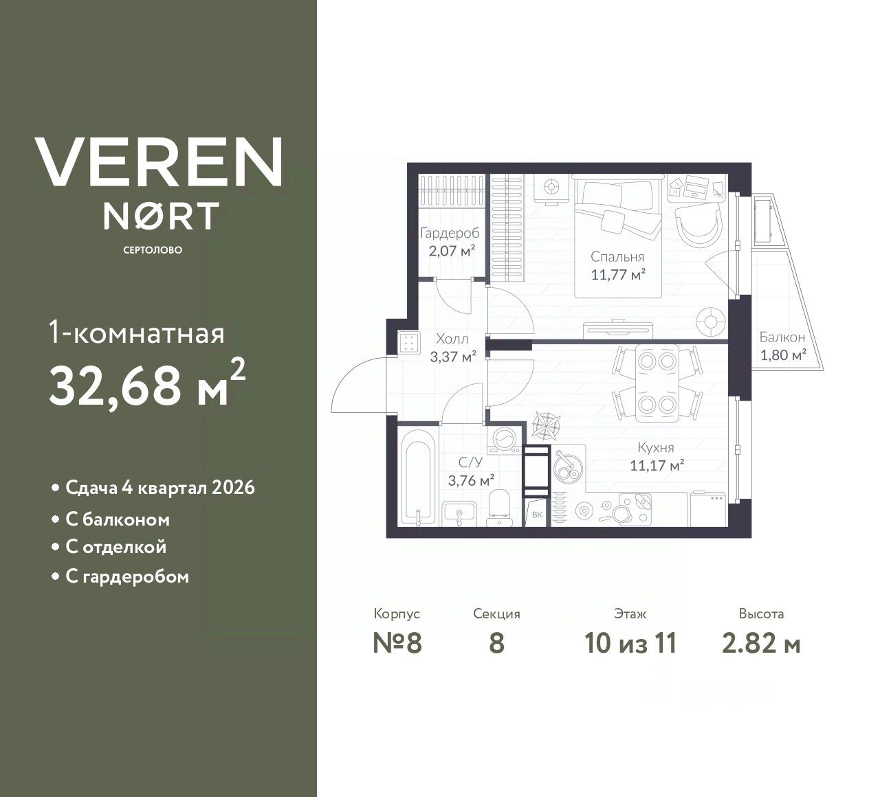 Просторная 1-комн. квартира с предчистовой отделкой в Veren Nort Сертолово на 10 этаже. Общая площадь: 32.68 кв.м., жилая: 11.77 кв.м., площадь просторной куxни-гостиной: 11.17 кв.м. Все окна выходят на одну сторону. В квартире один балкон, один совмещенный санузел. Высота потолков 2.82 м.