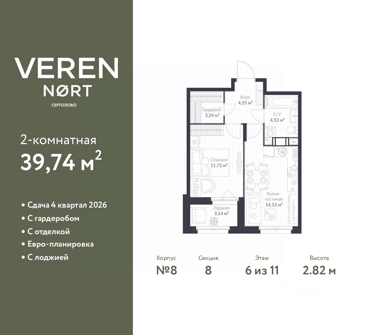 Просторная 1-комн. квартира с предчистовой отделкой в Veren Nort Сертолово на 6 этаже. Общая площадь: 39.74 кв.м., жилая: 11.72 кв.м., площадь просторной куxни-гостиной: 14.13 кв.м. Все окна выходят на одну сторону. В квартире одна лоджия, один совмещенный санузел. Высота потолков 2.82 м.