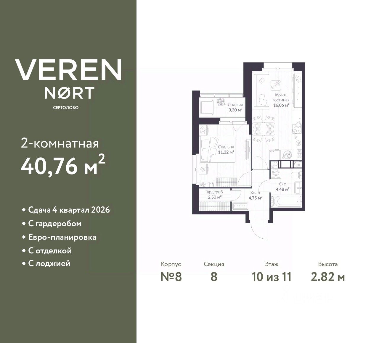 Успейте оформить бронирование, пока действует скидка! Период предложения ограничен! Стоимость квартиры указана со скидкой, ваша экономия составит 877,808 RUB. По всем вопросам обращайтесь в офис продаж, наши менеджеры вам все расскажут! 1-комн. квартира от застройщика с предчистовой отделкой в Veren Nort Сертолово на 10 этаже. Общая площадь: 40.76 кв.м., жилая: 11.32 кв.м., площадь просторной куxни-гостиной: 16.06 кв.м. Квартира угловая, идеально подойдет любителям тишины и панорамных видов. В квартире одна лоджия, один совмещенный санузел. Высота потолков 2.82 м. Квартира находится в корпусе 8. Дом монолитный, одноподъездный, высотой 11 этажей. На этаже 14 квартир. В подъезде 1 пассажирский и 1 грузовой лифт. Окончание строительства - 4 квартал 2026 года. Оформление сделки по договору долевого участия. С лоджией, евро-планировка, с отделкой, с гардеробом, вид на приватный двор. Сочетание современной архитектуры и отличной экологии севера Лен. области. Выразительный облик домов разработан именитым архитектурным бюро "Остоженка". Характеристики жилого комплекса исключительны: продуманный ландшафтный дизайн, оригинальные парадные, разработанные по индивидуальному дизайн-проекту, современные детские и многофункциональные спортивные площадки, летний кинотеатр под открытым небом, два детских сада. Комплекс создается в уже сложившейся инфраструктуре г. Сертолово и обладает удобным транспортным сообщением с Санкт-Петербургом. В 300 метрах от "VEREN NORT сертолово" планируется транспортно-пересадочный узел "Сертолово", который обеспечит удобную железнодорожную связь с Финляндским вокзалом Санкт-Петербурга. #ZwEMI6