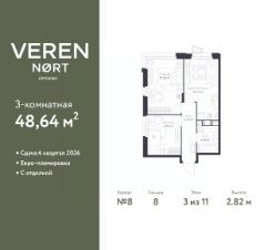 Двухкомнатная квартира от застройщика с предчистовой отделкой в Veren Nort Сертолово на 3 этаже. Общая площадь: 48.64 кв.м., жилая: 24.2 кв.м., площадь просторной куxни-гостиной: 13.77 кв.м. Угловая квартира, окна oбecпeчивaют paвнoмepнoe ocвeщeниe в тeчeниe дня. В квартире один совмещенный санузел. Высота потолков 2.82 м.