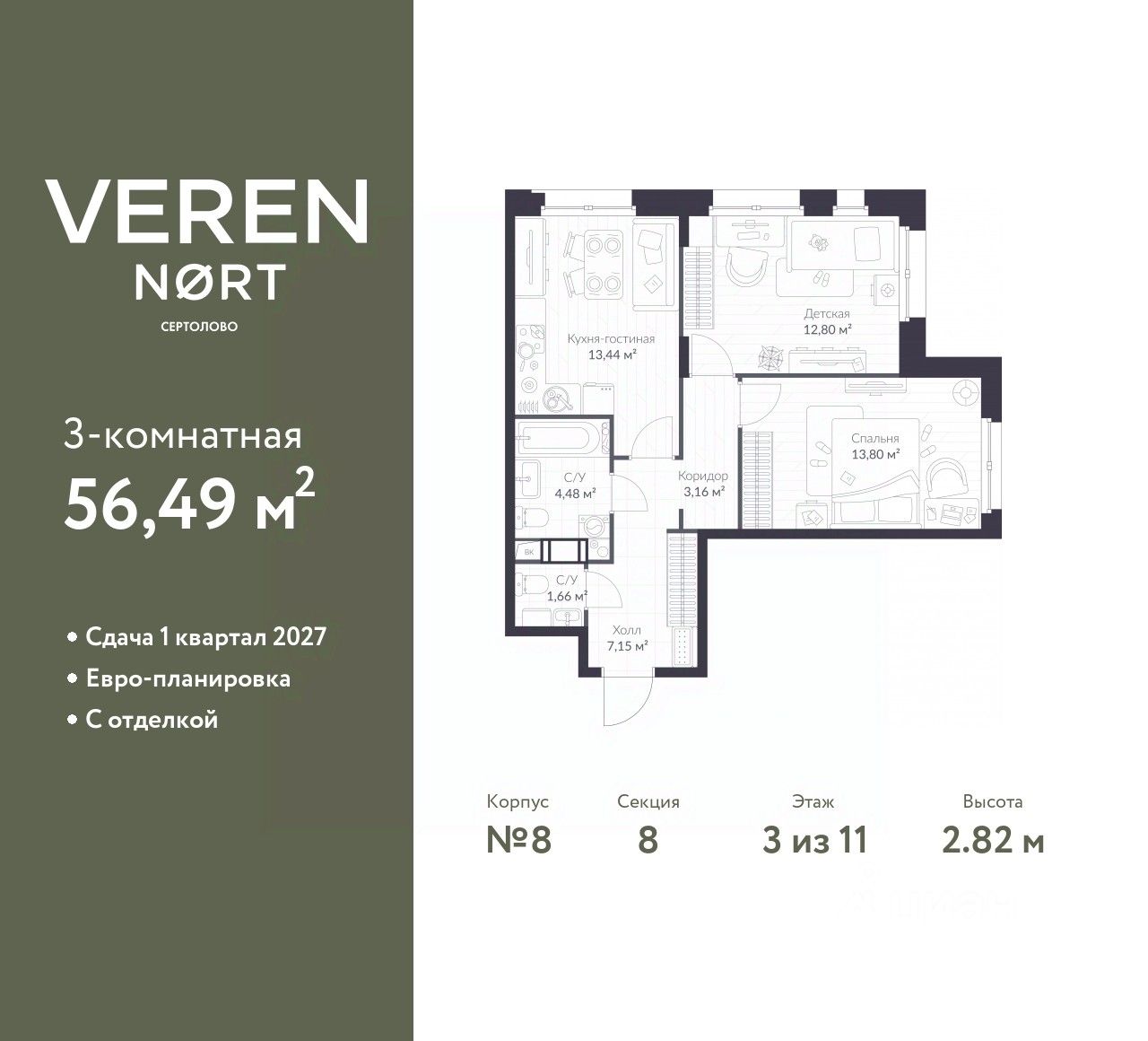 Просторная двухкомнатная квартира с предчистовой отделкой в Veren Nort Сертолово на 3 этаже. Общая площадь: 56.49 кв.м., жилая: 26.6 кв.м., площадь просторной куxни-гостиной: 13.44 кв.м. Квартира угловая, окна oбecпeчивaют paвнoмepнoe ocвeщeниe в тeчeниe дня. В квартире один совмещенный и один раздельный санузел. Высота потолков 2.82 м.