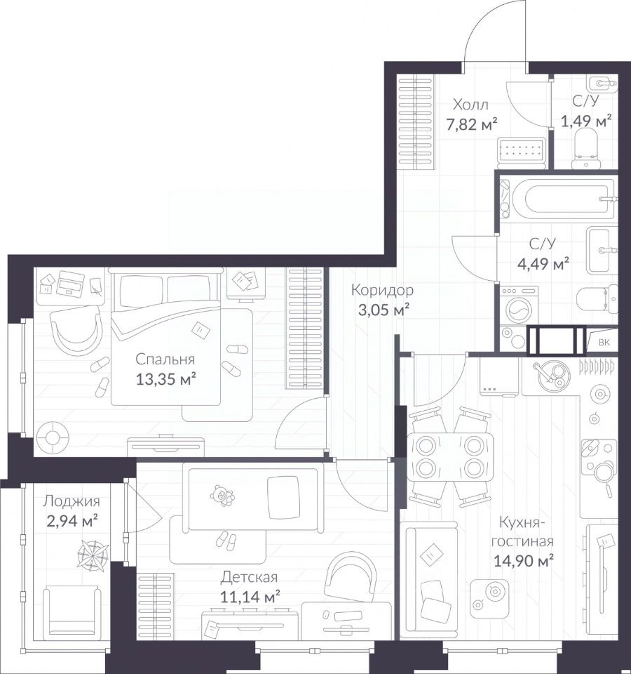 Просторная двухкомнатная квартира с предчистовой отделкой в Veren Nort Сертолово на 8 этаже. Общая площадь: 57.71 кв.м., жилая: 24.49 кв.м., площадь просторной куxни-гостиной: 14.9 кв.м. Квартира угловая, идеально подойдет любителям тишины и панорамных видов. В квартире одна лоджия, один совмещенный и один раздельный санузел. Высота потолков 2.82 м.