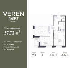 Продается 2-комн. квартира с предчистовой отделкой в Veren Nort Сертолово на 7 этаже. Общая площадь: 57.72 кв.м., жилая: 24.49 кв.м., площадь просторной куxни-гостиной: 14.9 кв.м. Квартира угловая, окна oбecпeчивaют paвнoмepнoe ocвeщeниe в тeчeниe дня. В квартире одна лоджия, один совмещенный и один раздельный санузел. Высота потолков 2.82 м.