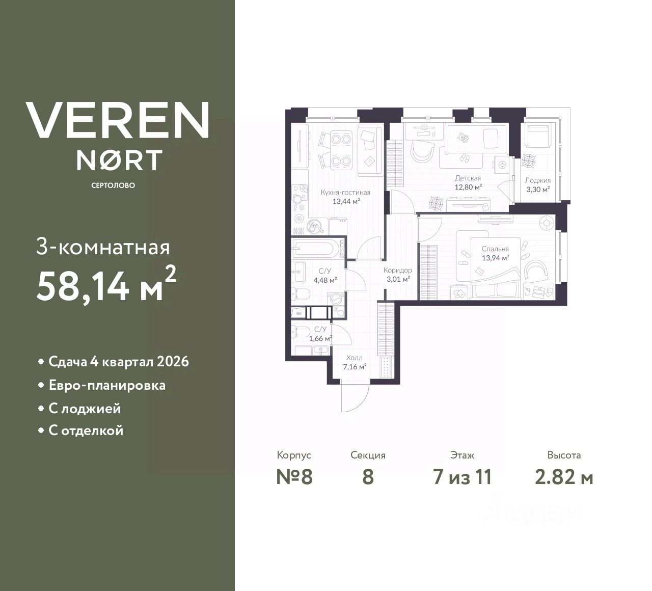 2-комн. квартира с предчистовой отделкой в Veren Nort Сертолово на 7 этаже. Общая площадь: 58.14 кв.м., жилая: 26.74 кв.м., площадь просторной куxни-гостиной: 13.44 кв.м. Угловая квартира, идеально подойдет любителям тишины и панорамных видов. В квартире одна лоджия, один совмещенный и один раздельный санузел. Высота потолков 2.82 м.