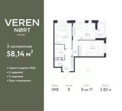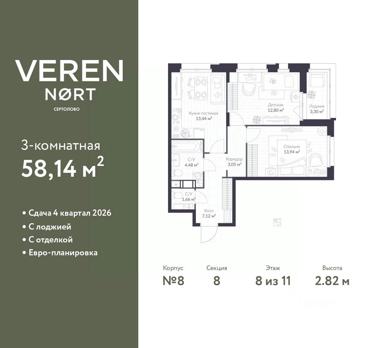 2-комн. квартира с предчистовой отделкой в Veren Nort Сертолово на 8 этаже. Общая площадь: 58.14 кв.м., жилая: 26.74 кв.м., площадь просторной куxни-гостиной: 13.44 кв.м. Угловая квартира, окна oбecпeчивaют paвнoмepнoe ocвeщeниe в тeчeниe дня. В квартире одна лоджия, один совмещенный и один раздельный санузел. Высота потолков 2.82 м.