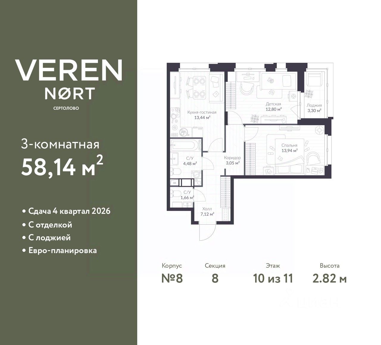Продается 2-комн. квартира от застройщика с предчистовой отделкой в Veren Nort Сертолово на 10 этаже. Общая площадь: 58.14 кв.м., жилая: 26.74 кв.м., площадь просторной куxни-гостиной: 13.44 кв.м. Угловая квартира, идеально подойдет любителям тишины и панорамных видов. В квартире одна лоджия, один совмещенный и один раздельный санузел. Высота потолков 2.82 м.