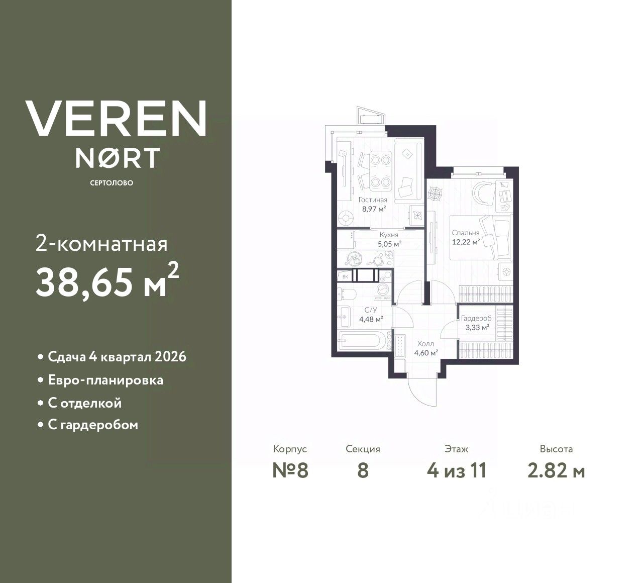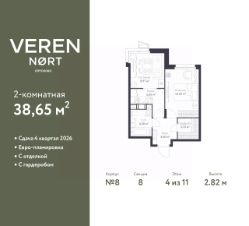 Продается 1-комн. квартира с предчистовой отделкой в Veren Nort Сертолово на 4 этаже. Общая площадь: 38.65 кв.м., жилая: 12.22 кв.м., площадь просторной куxни-гостиной: 14.03 кв.м. Все окна выходят на одну сторону. В квартире один совмещенный санузел. Высота потолков 2.82 м.