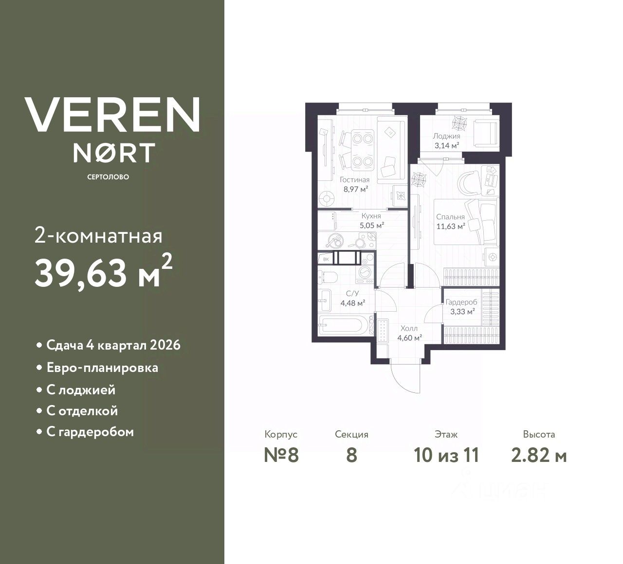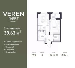 1-комн. квартира с предчистовой отделкой в Veren Nort Сертолово на 10 этаже. Общая площадь: 39.63 кв.м., жилая: 11.63 кв.м., площадь просторной куxни-гостиной: 14.02 кв.м. Все окна выходят на одну сторону. В квартире одна лоджия, один совмещенный санузел. Высота потолков 2.82 м.
