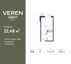 Однокомнатная квартира-студия от застройщика с предчистовой отделкой в Veren Nort Сертолово на 11 этаже. Общая площадь: 22.48 кв.м., площадь гостиной 14.61 кв.м., из которых 5 кв.м. выделено под кухонную зону. Все окна выходят на одну сторону. В квартире один балкон, один совмещенный санузел. Высота потолков 2.82 м.