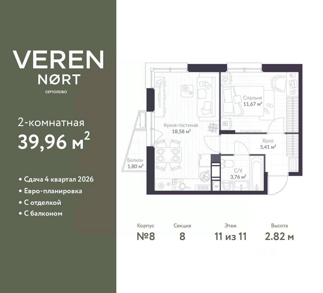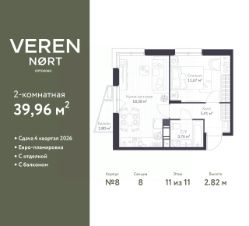 Просторная однокомнатная квартира с предчистовой отделкой в Veren Nort Сертолово на 11 этаже. Общая площадь: 39.96 кв.м., жилая: 11.67 кв.м., площадь просторной куxни-гостиной: 18.58 кв.м. Угловая квартира, идеально подойдет любителям тишины и панорамных видов. В квартире один балкон, один совмещенный санузел. Высота потолков 2.82 м.