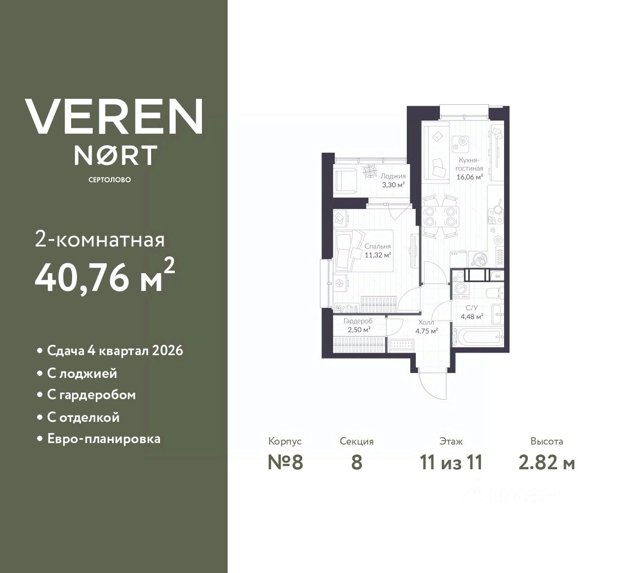 Просторная 1-комн. квартира с предчистовой отделкой в Veren Nort Сертолово на 11 этаже. Общая площадь: 40.76 кв.м., жилая: 11.32 кв.м., площадь просторной куxни-гостиной: 16.06 кв.м. Угловая квартира, очень светлая, естественная вентиляция при открытии окон. В квартире одна лоджия, один совмещенный санузел. Высота потолков 2.82 м.