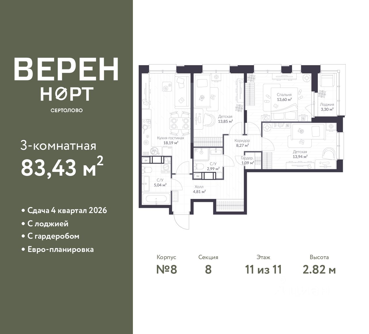 Трехкомнатная квартира в ЖК "Верен Норт Сертолово" на 11 этаже. Квартира без отделки, новый владелец может сделать ремонт по своему проекту. Общая площадь: 83.43 кв.м., жилая: 41.39 кв.м., площадь просторной куxни-гостиной: 18.19 кв.м. Угловая квартира, идеально подойдет любителям тишины и панорамных видов. В квартире одна лоджия, два совмещенных санузла. Высота потолков 2.82 м.