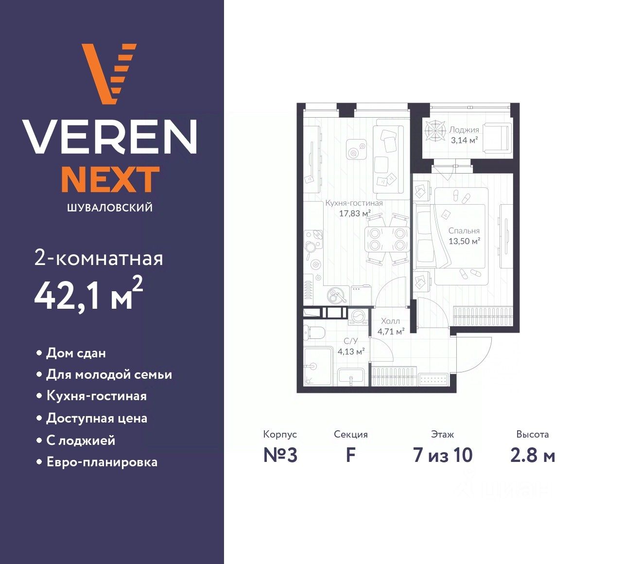 Однокомнатная квартира от застройщика в ЖК "VEREN NEXT Шуваловский" на 7 этаже. Квартира без отделки, после оформления собственности можно делать ремонт. Общая площадь: 42.1 кв.м., жилая: 13.5 кв.м., площадь просторной куxни-гостиной: 17.83 кв.м. Все окна выходят на одну сторону. В квартире одна лоджия, один совмещенный санузел. Высота потолков 2.8 м.