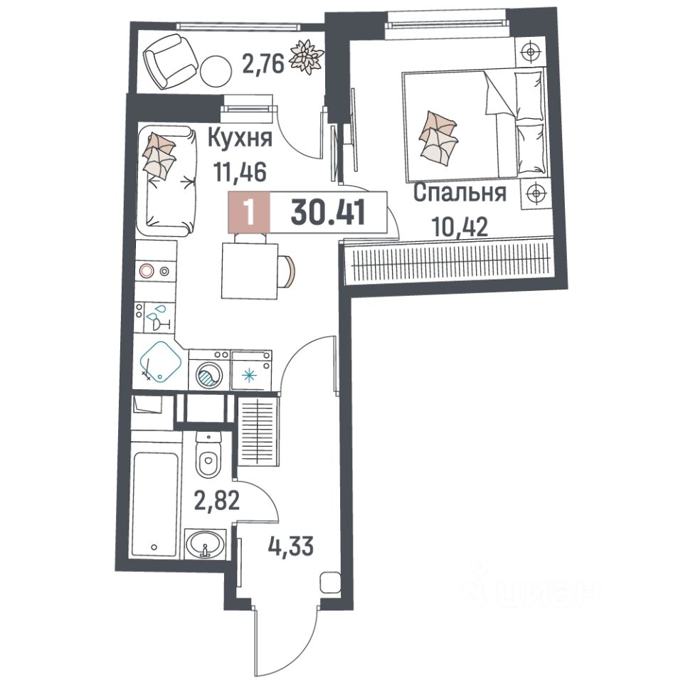 Общая площадь30,41 м²