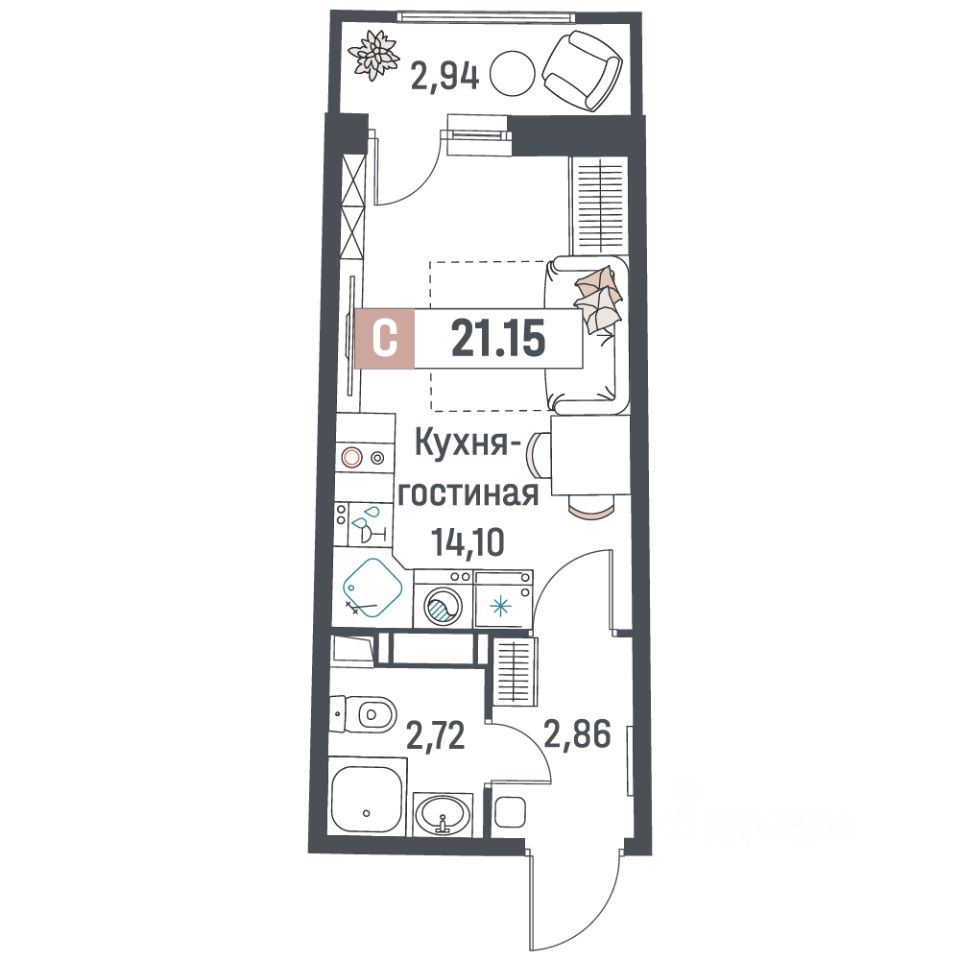 Общая площадь21,15 м²