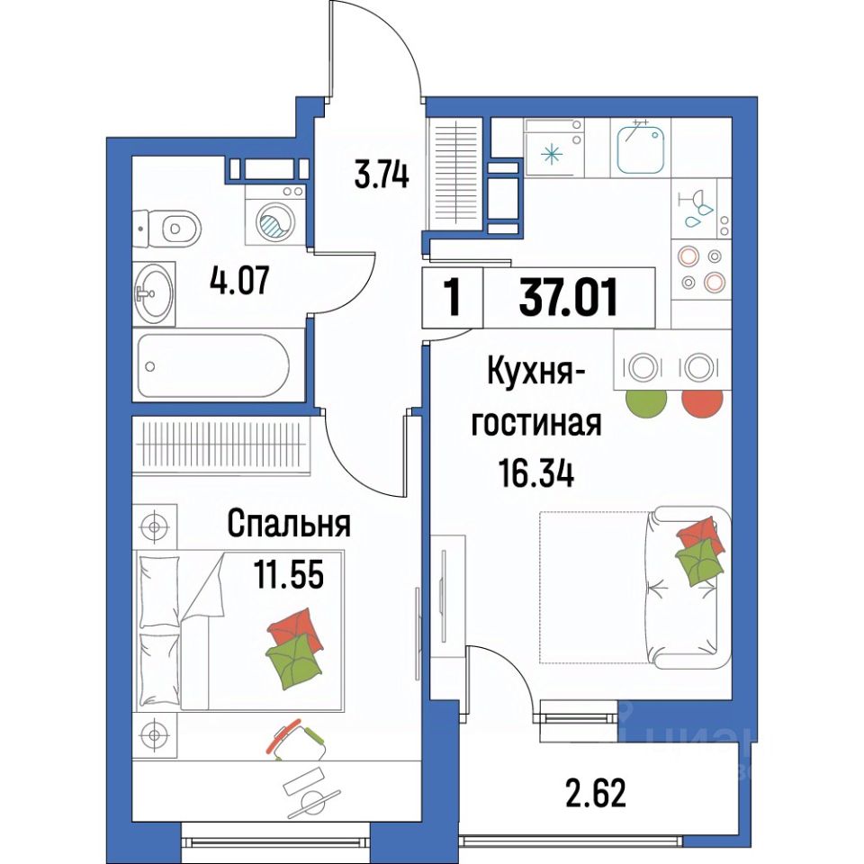 Общая площадь37,01 м²