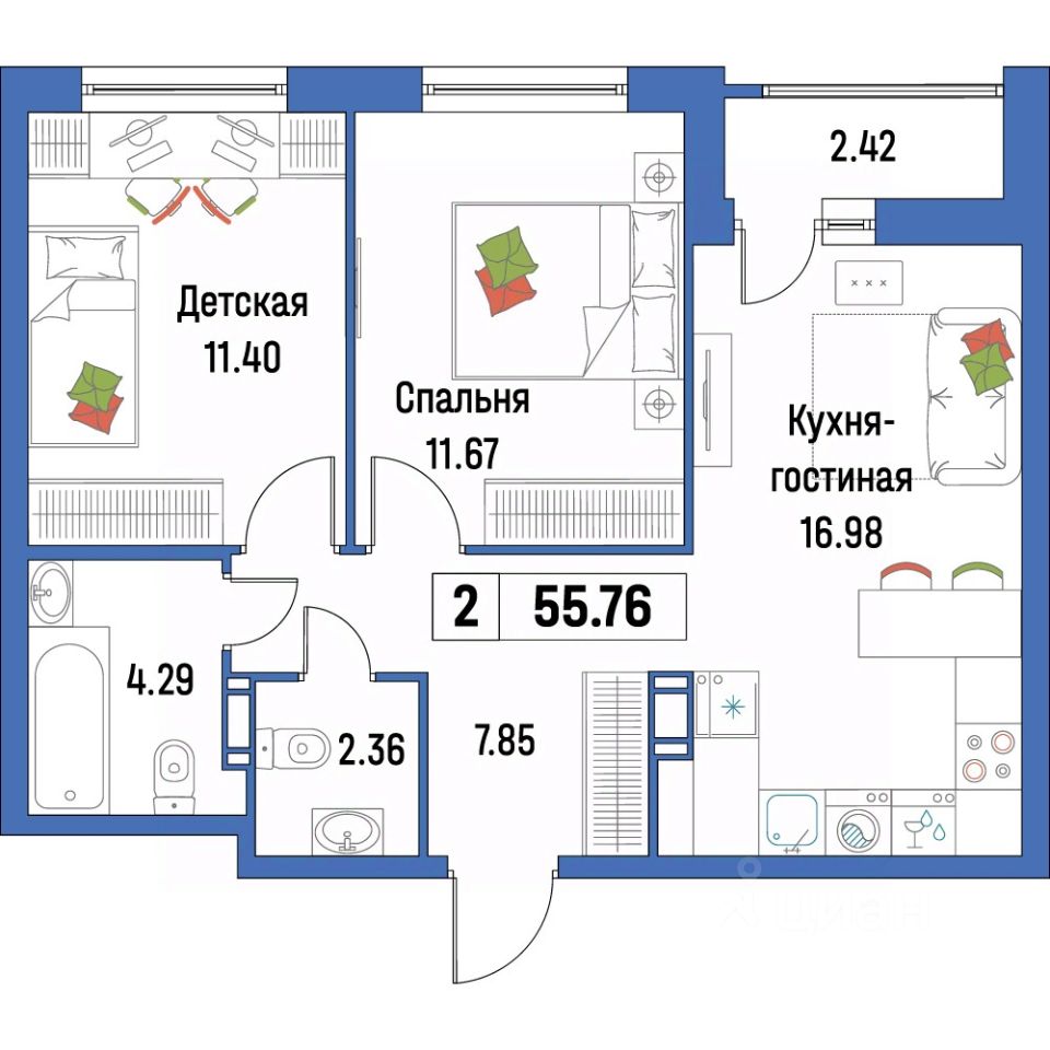Общая площадь55,76 м²