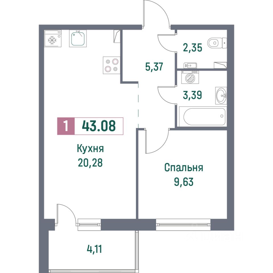 Общая площадь43,08 м²