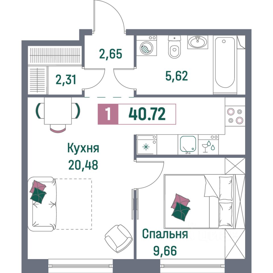 Общая площадь40,72 м²