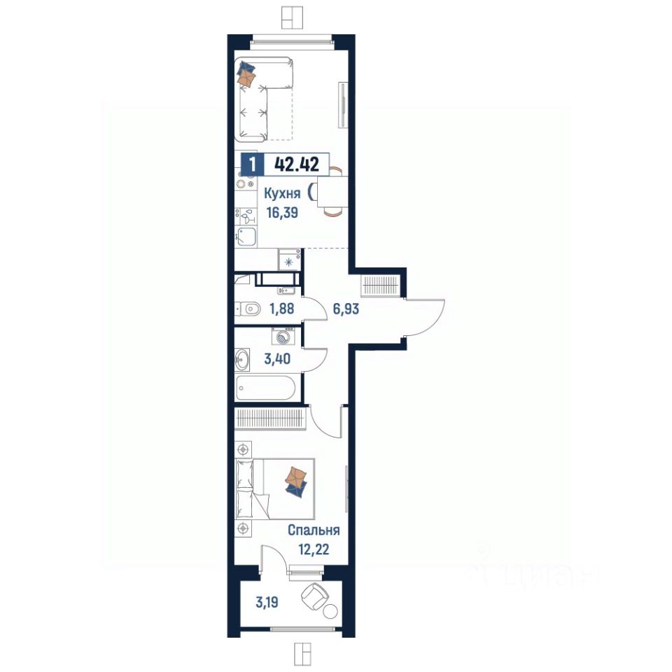 Общая площадь42,42 м²