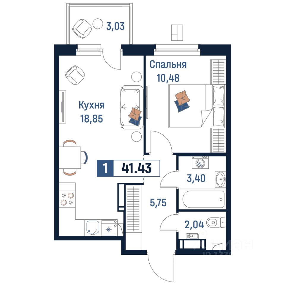 Общая площадь41,43 м²