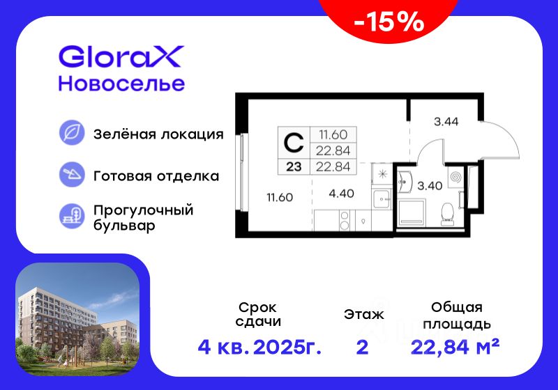 Продается квартира-студия на 2-м этаже в строящемся проекте комфорт-класса GloraX Новоселье. Общая площадь лота составляет 22,84 кв. м, из которых 11,60 кв. м отведено под жилую и 4,40 кв. м под кухонную зону. Номер квартиры - 23