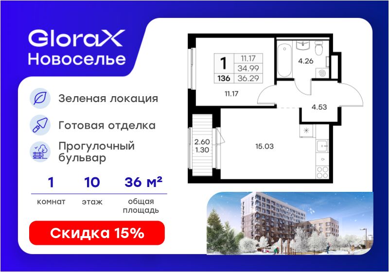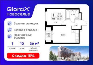 Продается 1-комн. квартира на 10-м этаже в строящемся проекте комфорт-класса GloraX Новоселье. Общая площадь лота составляет 36,29 кв. м, из которых 11,17 кв. м отведено под жилую и 15,03 кв. м под кухонную зону. Номер квартиры - 136