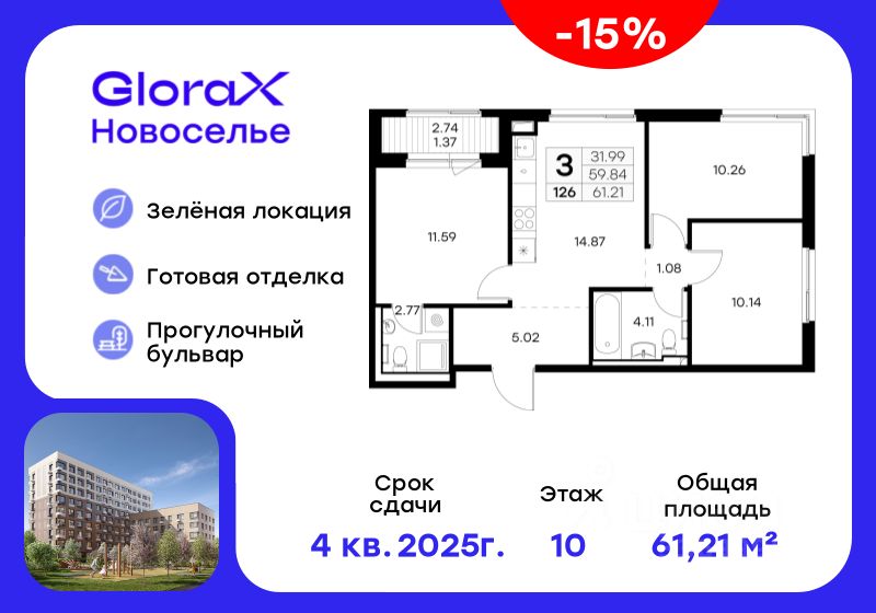 Продается 3-комн. квартира на 10-м этаже в строящемся проекте комфорт-класса GloraX Новоселье. Общая площадь лота составляет 61,21 кв. м, из которых 31,99 кв. м отведено под жилую и 14,87 кв. м под кухонную зону. Номер квартиры - 126