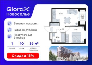 Продается 1-комн. квартира на 10-м этаже в строящемся проекте комфорт-класса GloraX Новоселье. Общая площадь лота составляет 36,29 кв. м, из которых 11,17 кв. м отведено под жилую и 15,03 кв. м под кухонную зону. Номер квартиры - 127