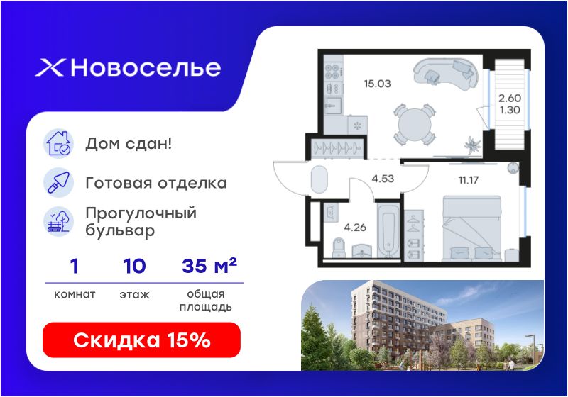 Продается 1-комн. квартира на 10-м этаже в строящемся проекте комфорт-класса Новоселье. Общая площадь лота составляет 36,29 кв. м, из которых 11,17 кв. м отведено под жилую и 15,03 кв. м под кухонную зону. Номер квартиры - 127