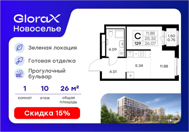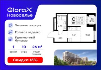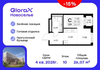 Продается квартира-студия на 10-м этаже в строящемся проекте комфорт-класса GloraX Новоселье. Общая площадь лота составляет 26,07 кв. м, из которых 11,88 кв. м отведено под жилую и 5,34 кв. м под кухонную зону. Номер квартиры - 129
