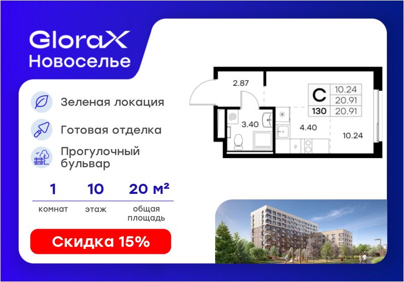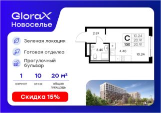 Продается квартира-студия на 10-м этаже в строящемся проекте комфорт-класса GloraX Новоселье. Общая площадь лота составляет 20,91 кв. м, из которых 10,24 кв. м отведено под жилую и 4,40 кв. м под кухонную зону. Номер квартиры - 130
