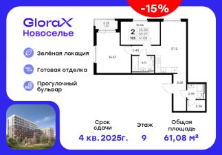 Продается 2-комн. квартира на 9-м этаже в строящемся проекте комфорт-класса GloraX Новоселье. Общая площадь лота составляет 61,08 кв. м, из которых 25,33 кв. м отведено под жилую и 17,12 кв. м под кухонную зону. Номер квартиры - 125