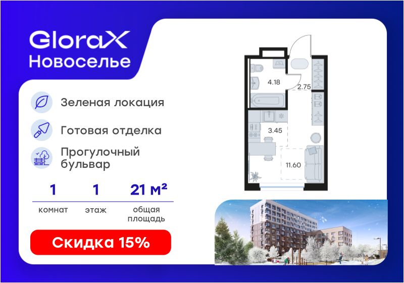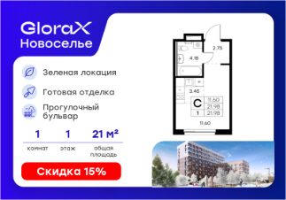 Продается квартира-студия на 1-м этаже в строящемся проекте комфорт-класса GloraX Новоселье. Общая площадь лота составляет 21,98 кв. м, из которых 11,60 кв. м отведено под жилую и 3,45 кв. м под кухонную зону. Номер квартиры - 1